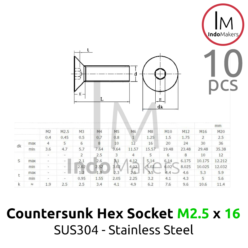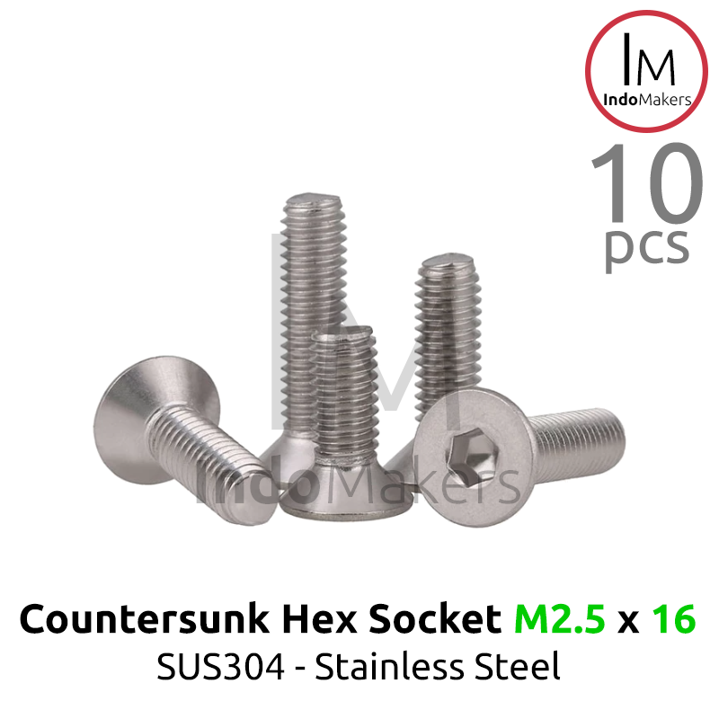 10pcs DIN7991 Hex Countersunk Screw / Baut Flat Hexa Stainless Steel M2.5 x 16