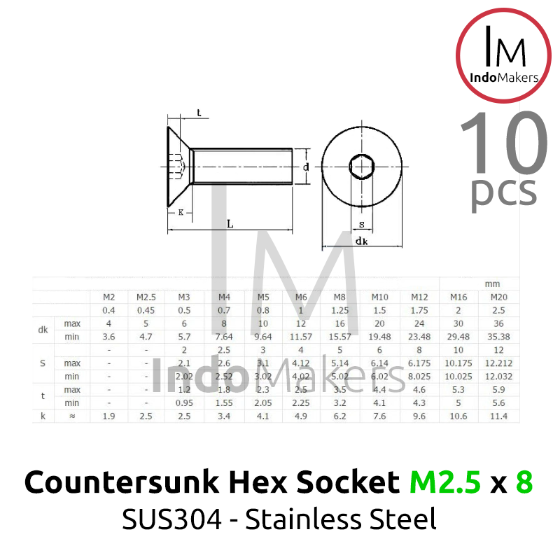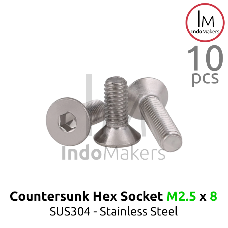 DIN7991 Hex Countersunk Screw / Baut Flat Hexa Stainless Steel M2.5 x 8 Isi 10pcs