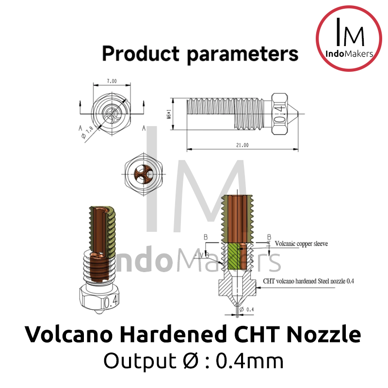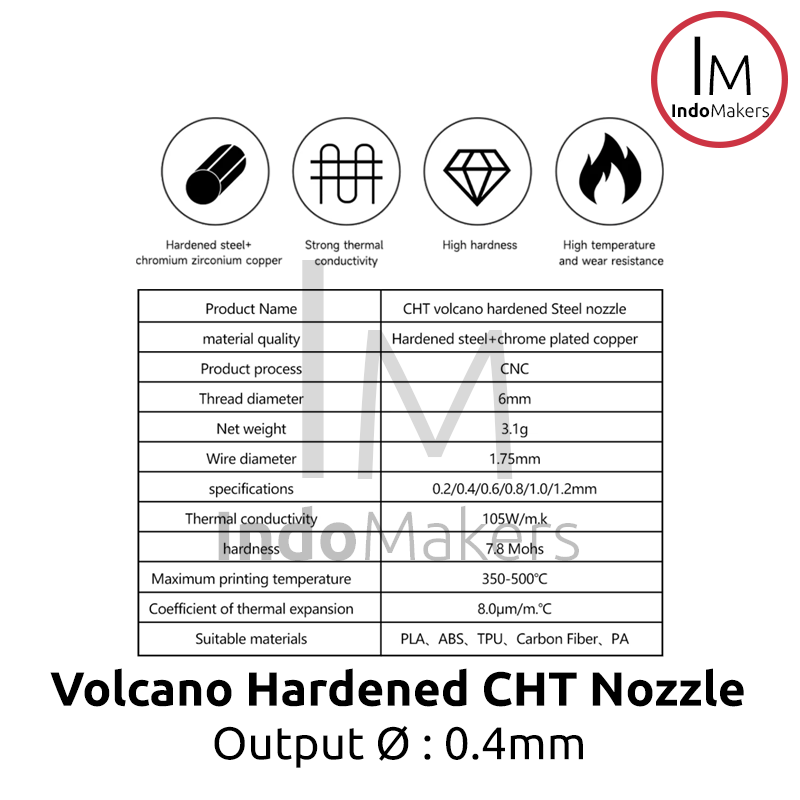 E3D Volcano 3D Printer CHT Hard-Steel Nozzle 0.4mm Output, Input 1.75mm